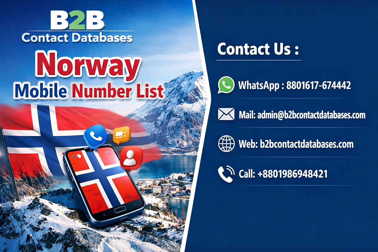 Norway Mobile Number List is helpful in data optimization. It helps in eliminating unnecessary information. Therefore, effective and concise lists can be created. Norway Mobile Number List supports analytical decision making. Optimization is successful when data quality is improved. The information should be rearranged according to the update year. As a result, communication is possible with the right number. Segmentation according to industry makes data management easier. Norway Mobile Number List increases sales efficiency. Therefore, Tele Marketing facility ensures optimized calling. Besides, time management is improved. Regular monitoring maintains data quality. Finally, B2B contact databases provides advanced data management services.