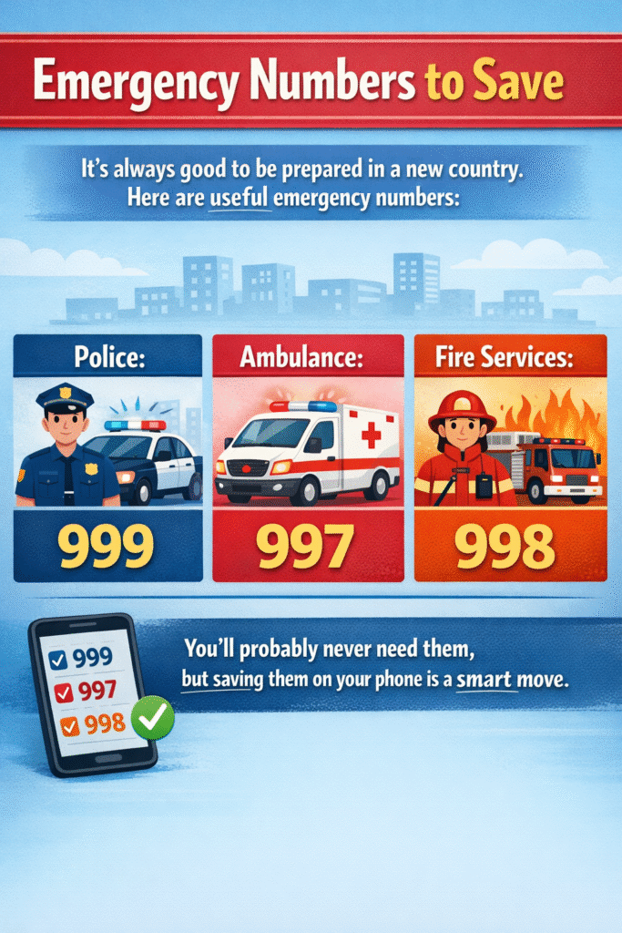 It’s always good to be prepared in a new country. Here are useful emergency numbers: